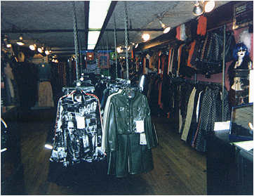 The front part is jewelry and clothes, the latter of the fetish variety. Lots of leather "undergarments", rubber dresses and similar fetishy clubwear. You will find brightly coloured mesh shirts, vinyl pants and black lace shirts. You'll find leather jackets and spiky rubber purses. You'll find sharp (again literally and figuratively) jewelry, including Marché Noir, Axel rings (which are the most exquisite, long jagged claw rings you will ever lay eyes upon), and piercing jewelry. Not to be forgotten, a rainbow of grim and perverse t-shirts is seen on the Eastern wall.